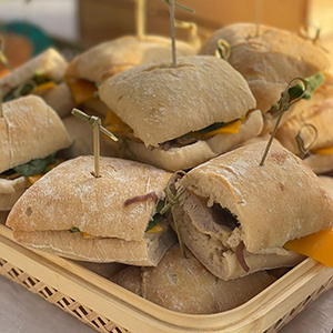 Mini Sandes de Frango, Cebola Caramelizada, Cheddar e Espinafres